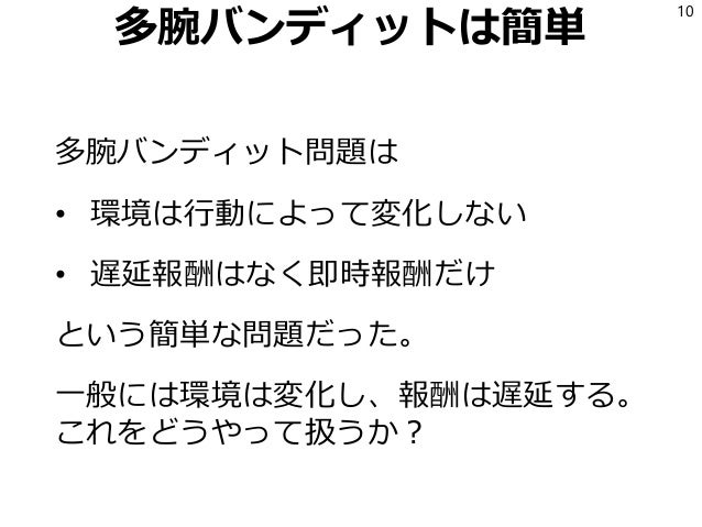 10. 10. 多腕バンディットは簡単 多腕バンディット問題は • 環境は行動によって変化しない • 遅延報酬はなく即時報酬だけ という簡単な問題だった。 一般には環境は変化し、報酬は遅延する。 これをどうやって扱うか? 10