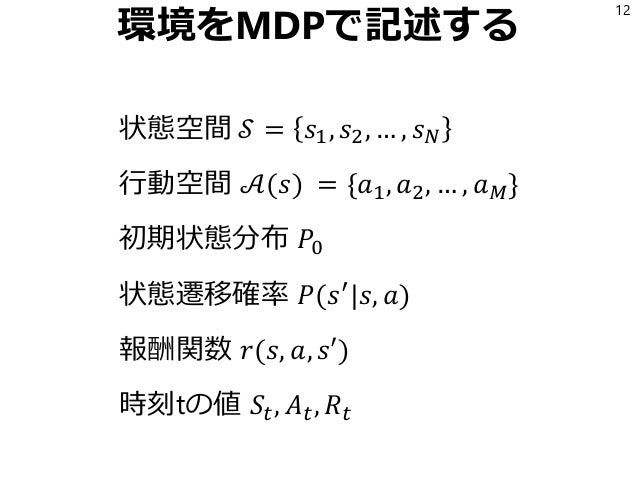 12. 12. 環境をMDPで記述する 状態空間 𝒮 = 𝑠1, 𝑠2, … , 𝑠 𝑁 行動空間 𝒜(𝑠) = {𝑎1, 𝑎2, … , 𝑎 𝑀} 初期状態分布 𝑃0 状態遷移確率 𝑃(𝑠′ |𝑠, 𝑎) 報酬関数 𝑟(𝑠, 𝑎, 𝑠′) 時刻tの値 𝑆𝑡, 𝐴 𝑡, 𝑅𝑡 12