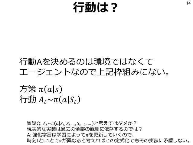 14. 14. 行動は? 行動Aを決めるのは環境ではなくて エージェントなので上記枠組みにない。 方策 𝜋 𝑎 𝑠 行動 𝐴 𝑡~𝜋 𝑎 𝑆𝑡 14 質疑Q: 𝐴 𝑡~𝜋 𝑎 𝑆𝑡, 𝑆𝑡−1, 𝑆𝑡−2, … と考えてはダメか? 現実的な実装は過去の全部の観測に依存するのでは? A: 強化学習は学習によって𝜋を更新していくので、 時刻tとt-1とで𝜋が異なると考えればこの定式化でもその実装に矛盾しない。