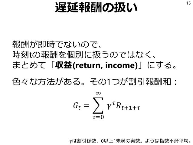 15. 15. 遅延報酬の扱い 報酬が即時でないので、 時刻tの報酬を個別に扱うのではなく、 まとめて「収益(return, income)」にする。 色々な方法がある。その1つが割引報酬和: 𝐺𝑡 = ෍ 𝜏=0 ∞ 𝛾 𝜏 𝑅𝑡+1+𝜏 15 𝛾は割引係数、0以上1未満の実数。ようは指数平滑平均。