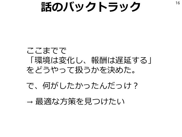 16. 16. 話のバックトラック ここまでで 「環境は変化し、報酬は遅延する」 をどうやって扱うかを決めた。 で、何がしたかったんだっけ? → 最適な方策を見つけたい 16