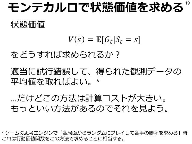 19. 19. モンテカルロで状態価値を求める 状態価値 𝑉 𝑠 = 𝔼[𝐺𝑡|𝑆𝑡 = 𝑠] をどうすれば求められるか? 適当に試行錯誤して、得られた観測データの 平均値を取ればよい。* …だけどこの方法は計算コストが大きい。 もっといい方法があるのでそれを見よう。 19 * ゲームの思考エンジンで「各局面からランダムにプレイして各手の勝率を求める」時 これは行動価値関数をこの方法で求めることに相当する。