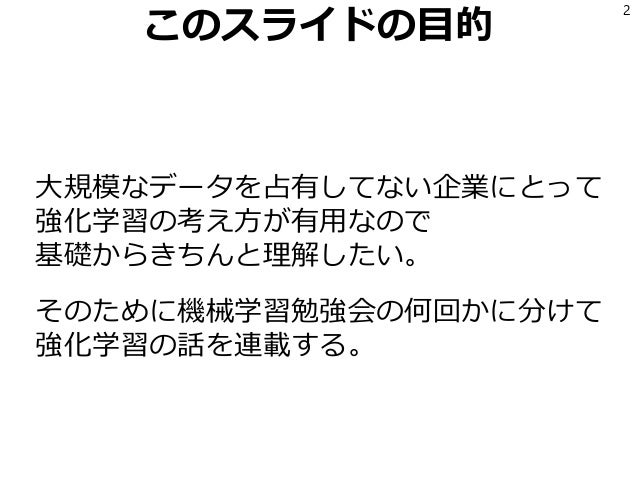 2. 2. このスライドの目的 大規模なデータを占有してない企業にとって 強化学習の考え方が有用なので 基礎からきちんと理解したい。 そのために機械学習勉強会の何回かに分けて 強化学習の話を連載する。 2