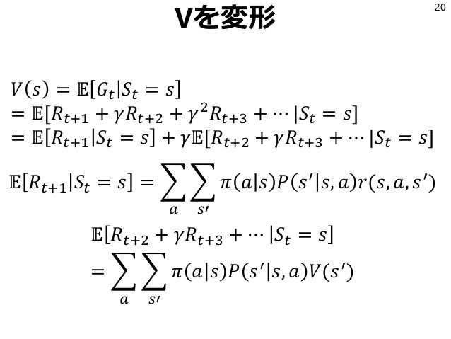 20. 20. Vを変形 𝑉 𝑠 = 𝔼 𝐺𝑡 𝑆𝑡 = 𝑠 = 𝔼[𝑅𝑡+1 + 𝛾𝑅𝑡+2 + 𝛾2 𝑅𝑡+3 + ⋯ |𝑆𝑡 = 𝑠] = 𝔼 𝑅𝑡+1 𝑆𝑡 = 𝑠 + 𝛾𝔼[𝑅𝑡+2 + 𝛾𝑅𝑡+3 + ⋯ |𝑆𝑡 = 𝑠] 𝔼 𝑅𝑡+1 𝑆𝑡 = 𝑠 = ෍ 𝑎 ෍ 𝑠′ 𝜋 𝑎 𝑠 𝑃 𝑠′ 𝑠, 𝑎 𝑟(𝑠, 𝑎, 𝑠′ ) 𝔼 𝑅𝑡+2 + 𝛾𝑅𝑡+3 + ⋯ 𝑆𝑡 = 𝑠 = ෍ 𝑎 ෍ 𝑠′ 𝜋 𝑎 𝑠 𝑃 𝑠′ 𝑠, 𝑎 𝑉(𝑠′ ) 20