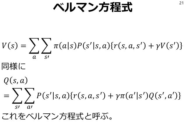 21. 21. ベルマン方程式 𝑉 𝑠 = ෍ 𝑎 ෍ 𝑠′ 𝜋 𝑎 𝑠 𝑃 𝑠′ 𝑠, 𝑎 𝑟 𝑠, 𝑎, 𝑠′ + 𝛾𝑉 𝑠′ 同様に 𝑄 𝑠, 𝑎 = ෍ 𝑠′ ෍ 𝑎′ 𝑃 𝑠′ 𝑠, 𝑎 𝑟 𝑠, 𝑎, 𝑠′ + 𝛾𝜋 𝑎′ 𝑠′ 𝑄 𝑠′ , 𝑎′ これをベルマン方程式と呼ぶ。 21