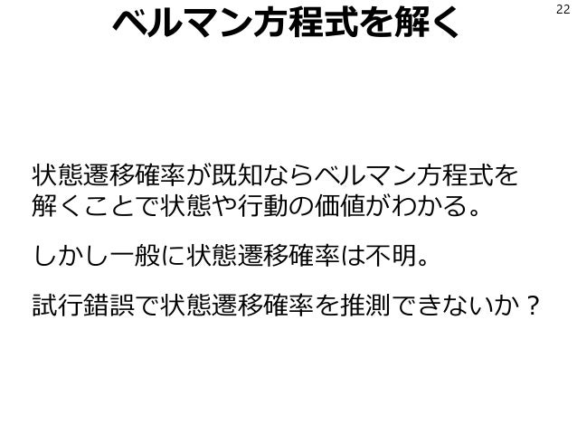 22. 22. ベルマン方程式を解く 状態遷移確率が既知ならベルマン方程式を 解くことで状態や行動の価値がわかる。 しかし一般に状態遷移確率は不明。 試行錯誤で状態遷移確率を推測できないか? 22