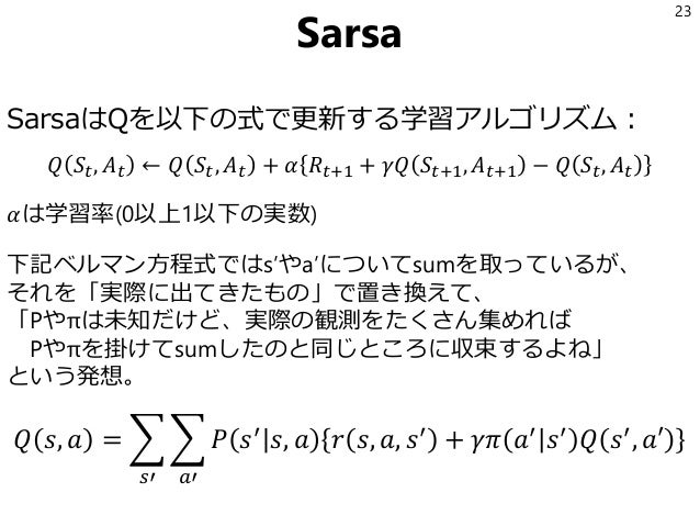 23. 23. Sarsa SarsaはQを以下の式で更新する学習アルゴリズム: 𝑄 𝑆𝑡, 𝐴 𝑡 ← 𝑄 𝑆𝑡, 𝐴 𝑡 + 𝛼 𝑅𝑡+1 + 𝛾𝑄 𝑆𝑡+1, 𝐴 𝑡+1 − 𝑄 𝑆𝑡, 𝐴 𝑡 𝛼は学習率(0以上1以下の実数) 下記ベルマン方程式ではs’やa’についてsumを取っているが、 それを「実際に出てきたもの」で置き換えて、 「Pやπは未知だけど、実際の観測をたくさん集めれば Pやπを掛けてsumしたのと同じところに収束するよね」 という発想。 𝑄 𝑠, 𝑎 = ෍ 𝑠′ ෍ 𝑎′ 𝑃 𝑠′ 𝑠, 𝑎 𝑟 𝑠, 𝑎, 𝑠′ + 𝛾𝜋 𝑎′ 𝑠′ 𝑄 𝑠′, 𝑎′ 23