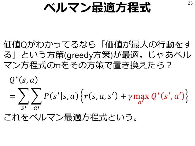 25. 25. ベルマン最適方程式 価値Qがわかってるなら「価値が最大の行動をす る」という方策(greedy方策)が最適。じゃあベル マン方程式のπをその方策で置き換えたら? 𝑄∗ 𝑠, 𝑎 = ෍ 𝑠′ ෍ 𝑎′ 𝑃 𝑠′ 𝑠, 𝑎 𝑟 𝑠, 𝑎, 𝑠′ + 𝛾max 𝑎′ 𝑄∗ 𝑠′ , 𝑎′ これをベルマン最適方程式という。 25