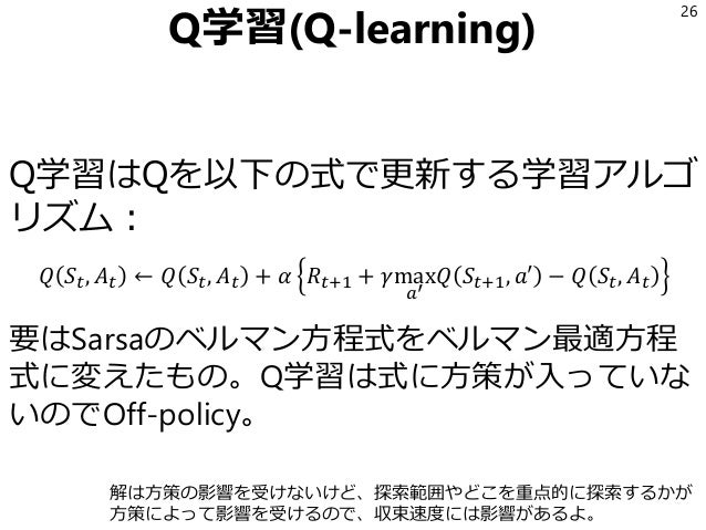 26. 26. Q学習(Q-learning) Q学習はQを以下の式で更新する学習アルゴ リズム: 𝑄 𝑆𝑡, 𝐴 𝑡 ← 𝑄 𝑆𝑡, 𝐴 𝑡 + 𝛼 𝑅𝑡+1 + 𝛾max 𝑎′ 𝑄 𝑆𝑡+1, 𝑎′ − 𝑄 𝑆𝑡, 𝐴 𝑡 要はSarsaのベルマン方程式をベルマン最適方程 式に変えたもの。Q学習は式に方策が入っていな いのでOff-policy。 26 解は方策の影響を受けないけど、探索範囲やどこを重点的に探索するかが 方策によって影響を受けるので、収束速度には影響があるよ。