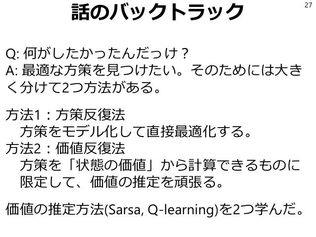 27. 27. 話のバックトラック Q: 何がしたかったんだっけ? A: 最適な方策を見つけたい。そのためには大き く分けて2つ方法がある。 方法1:方策反復法 方策をモデル化して直接最適化する。 方法2:価値反復法 方策を「状態の価値」から計算できるものに 限定して、価値の推定を頑張る。 価値の推定方法(Sarsa, Q-learning)を2つ学んだ。 27