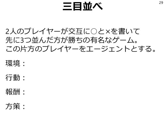 29. 29. 三目並べ 2人のプレイヤーが交互に○と×を書いて 先に3つ並んだ方が勝ちの有名なゲーム。 この片方のプレイヤーをエージェントとする。 環境: 行動: 報酬: 方策: 29