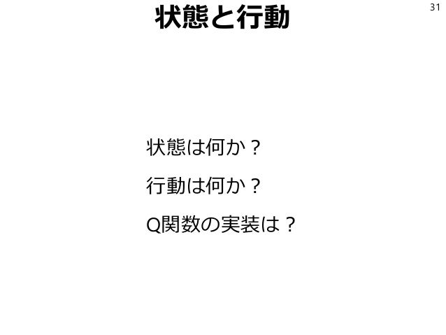 31. 31. 状態と行動 状態は何か? 行動は何か? Q関数の実装は? 31