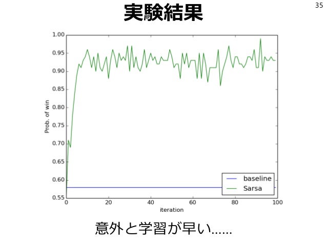 34. 34. 実験 ランダム同士の対戦は1万回中 先手勝ち: 5785, 後手勝ち: 2918, 引き分け: 1297 だったので、0.578をベースラインとする。 Sarsa(先手)とランダム(後手)で10000試合し、 100試合ごとの勝率をプロットした。 Sarsaのパラメータ: π=greedy方策, α=0.5, γ=0.9 34