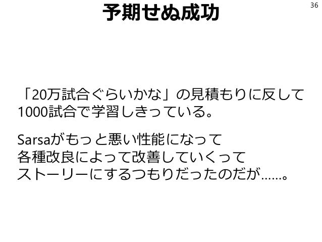 36. 36. 予期せぬ成功 「20万試合ぐらいかな」の見積もりに反して 1000試合で学習しきっている。 Sarsaがもっと悪い性能になって 各種改良によって改善していくって ストーリーにするつもりだったのだが……。 36