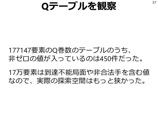 37. 37. Qテーブルを観察 177147要素のQ巻数のテーブルのうち、 非ゼロの値が入っているのは450件だった。 17万要素は到達不能局面や非合法手を含む値 なので、実際の探索空間はもっと狭かった。 37