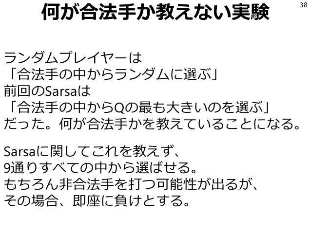 38. 38. 何が合法手か教えない実験 ランダムプレイヤーは 「合法手の中からランダムに選ぶ」 前回のSarsaは 「合法手の中からQの最も大きいのを選ぶ」 だった。何が合法手かを教えていることになる。 Sarsaに関してこれを教えず、 9通りすべての中から選ばせる。 もちろん非合法手を打つ可能性が出るが、 その場合、即座に負けとする。 38
