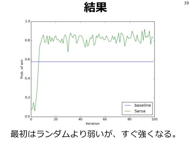 39. 39. 結果 最初はランダムより弱いが、すぐ強くなる。 39