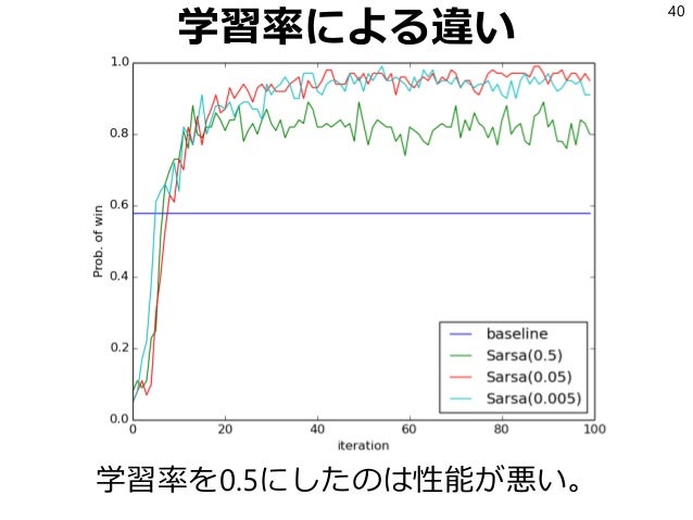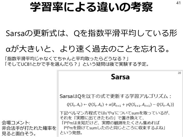 41. 41. 学習率による違いの考察 Sarsaの更新式は、Qを指数平滑平均している形 αが大きいと、より速く過去のことを忘れる。 41 「指数平滑平均じゃなくてちゃんと平均取ったらどうなる?」 「そしてUCB1とかで手を選んだら?」という疑問は後で実験する予定。 会場コメント: 非合法手が打たれた確率を 見ると面白そう。