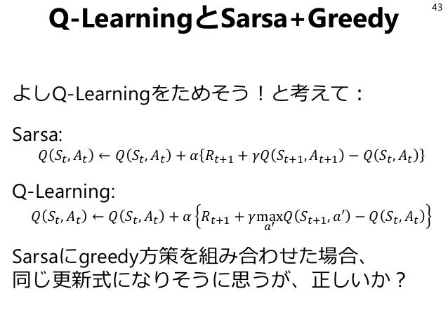 43. 43. Q-LearningとSarsa+Greedy よしQ-Learningをためそう!と考えて: Sarsa: 𝑄 𝑆𝑡, 𝐴 𝑡 ← 𝑄 𝑆𝑡, 𝐴 𝑡 + 𝛼 𝑅𝑡+1 + 𝛾𝑄 𝑆𝑡+1, 𝐴 𝑡+1 − 𝑄 𝑆𝑡, 𝐴 𝑡 Q-Learning: 𝑄 𝑆𝑡, 𝐴 𝑡 ← 𝑄 𝑆𝑡, 𝐴 𝑡 + 𝛼 𝑅𝑡+1 + 𝛾max 𝑎′ 𝑄 𝑆𝑡+1, 𝑎′ − 𝑄 𝑆𝑡, 𝐴 𝑡 Sarsaにgreedy方策を組み合わせた場合、 同じ更新式になりそうに思うが、正しいか? 43