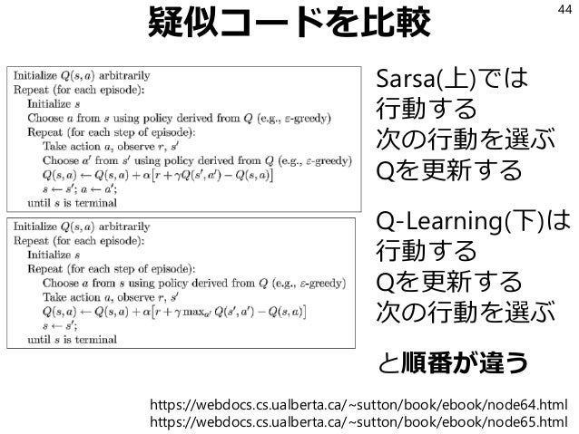 44. 44. 疑似コードを比較 Sarsa(上)では 行動する 次の行動を選ぶ Qを更新する Q-Learning(下)は 行動する Qを更新する 次の行動を選ぶ と順番が違う 44 https://webdocs.cs.ualberta.ca/~sutton/book/ebook/node64.html https://webdocs.cs.ualberta.ca/~sutton/book/ebook/node65.html