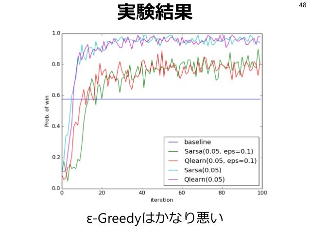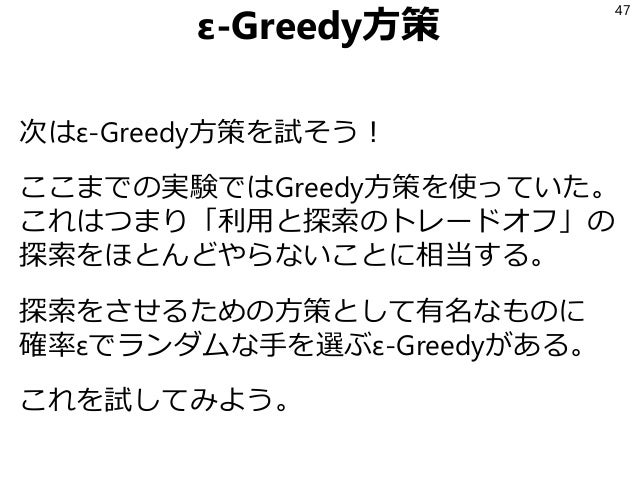 47. 47. ε-Greedy方策 次はε-Greedy方策を試そう! ここまでの実験ではGreedy方策を使っていた。 これはつまり「利用と探索のトレードオフ」の 探索をほとんどやらないことに相当する。 探索をさせるための方策として有名なものに 確率εでランダムな手を選ぶε-Greedyがある。 これを試してみよう。 47