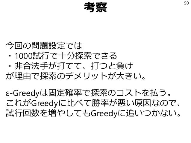 50. 50. 考察 今回の問題設定では ・1000試行で十分探索できる ・非合法手が打てて、打つと負け が理由で探索のデメリットが大きい。 ε-Greedyは固定確率で探索のコストを払う。 これがGreedyに比べて勝率が悪い原因なので、 試行回数を増やしてもGreedyに追いつかない。 50