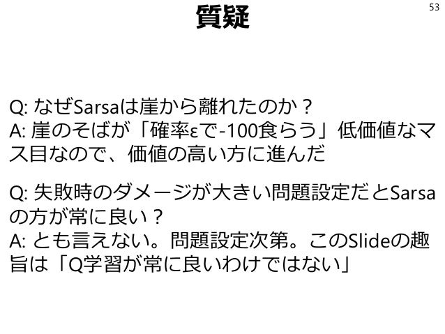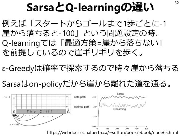 52. 52. SarsaとQ-learningの違い 例えば「スタートからゴールまで1歩ごとに-1 崖から落ちると-100」という問題設定の時、 Q-learningでは「最適方策=崖から落ちない」 を前提しているので崖ギリギリを歩く。 ε-Greedyは確率で探索するので時々崖から落ちる Sarsaはon-policyだから崖から離れた道を通る。 52 https://webdocs.cs.ualberta.ca/~sutton/book/ebook/node65.html