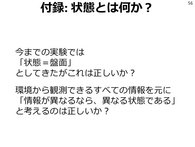 56. 56. 付録: 状態とは何か? 今までの実験では 「状態=盤面」 としてきたがこれは正しいか? 環境から観測できるすべての情報を元に 「情報が異なるなら、異なる状態である」 と考えるのは正しいか? 56