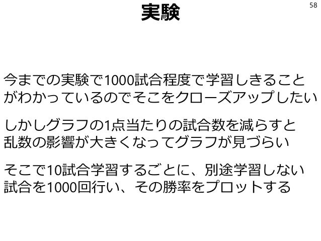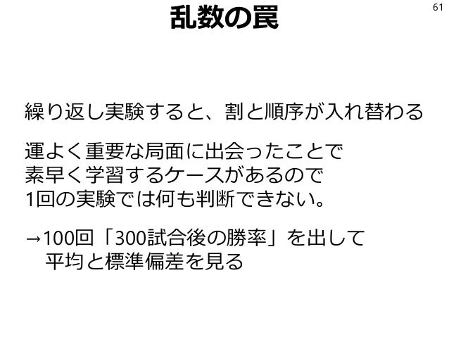 61. 61. 乱数の罠 繰り返し実験すると、割と順序が入れ替わる 運よく重要な局面に出会ったことで 素早く学習するケースがあるので 1回の実験では何も判断できない。 →100回「300試合後の勝率」を出して 平均と標準偏差を見る 61