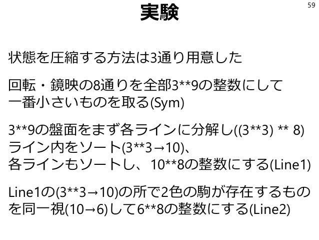 59. 59. 実験 状態を圧縮する方法は3通り用意した 回転・鏡映の8通りを全部3**9の整数にして 一番小さいものを取る(Sym) 3**9の盤面をまず各ラインに分解し((3**3) ** 8) ライン内をソート(3**3→10)、 各ラインもソートし、10**8の整数にする(Line1) Line1の(3**3→10)の所で2色の駒が存在するもの を同一視(10→6)して6**8の整数にする(Line2) 59