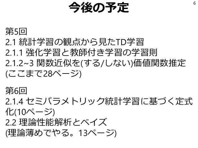 6. 6. 今後の予定 第5回 2.1 統計学習の観点から見たTD学習 2.1.1 強化学習と教師付き学習の学習則 2.1.2~3 関数近似を(する/しない)価値関数推定 (ここまで28ページ) 第6回 2.1.4 セミパラメトリック統計学習に基づく定式 化(10ページ) 2.2 理論性能解析とベイズ (理論薄めでやる。13ページ) 6