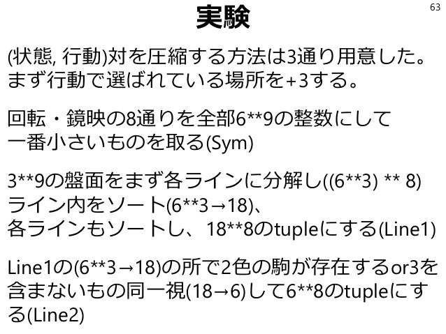 63. 63. 実験 (状態, 行動)対を圧縮する方法は3通り用意した。 まず行動で選ばれている場所を+3する。 回転・鏡映の8通りを全部6**9の整数にして 一番小さいものを取る(Sym) 3**9の盤面をまず各ラインに分解し((6**3) ** 8) ライン内をソート(6**3→18)、 各ラインもソートし、18**8のtupleにする(Line1) Line1の(6**3→18)の所で2色の駒が存在するor3を 含まないもの同一視(18→6)して6**8のtupleにす る(Line2) 63