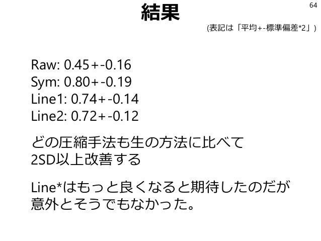 64. 64. 結果 Raw: 0.45+-0.16 Sym: 0.80+-0.19 Line1: 0.74+-0.14 Line2: 0.72+-0.12 どの圧縮手法も生の方法に比べて 2SD以上改善する Line*はもっと良くなると期待したのだが 意外とそうでもなかった。 64 (表記は「平均+-標準偏差*2」)