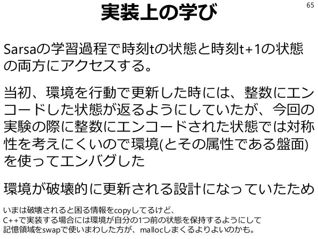 65. 65. 実装上の学び Sarsaの学習過程で時刻tの状態と時刻t+1の状態 の両方にアクセスする。 当初、環境を行動で更新した時には、整数にエン コードした状態が返るようにしていたが、今回の 実験の際に整数にエンコードされた状態では対称 性を考えにくいので環境(とその属性である盤面) を使ってエンバグした 環境が破壊的に更新される設計になっていたため 65 いまは破壊されると困る情報をcopyしてるけど、 C++で実装する場合には環境が自分の1つ前の状態を保持するようにして 記憶領域をswapで使いまわした方が、mallocしまくるよりよいのかも。