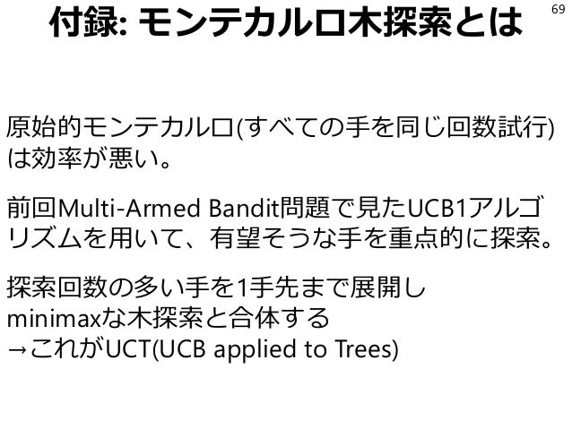 69. 69. 付録: モンテカルロ木探索とは 原始的モンテカルロ(すべての手を同じ回数試行) は効率が悪い。 前回Multi-Armed Bandit問題で見たUCB1アルゴ リズムを用いて、有望そうな手を重点的に探索。 探索回数の多い手を1手先まで展開し minimaxな木探索と合体する →これがUCT(UCB applied to Trees) 69