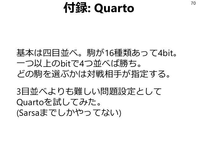 70. 70. 付録: Quarto 基本は四目並べ。駒が16種類あって4bit。 一つ以上のbitで4つ並べば勝ち。 どの駒を選ぶかは対戦相手が指定する。 3目並べよりも難しい問題設定として Quartoを試してみた。 (Sarsaまでしかやってない) 70