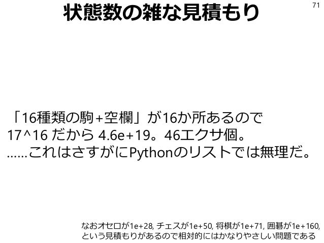 71. 71. 状態数の雑な見積もり 「16種類の駒+空欄」が16か所あるので 17^16 だから 4.6e+19。46エクサ個。 ……これはさすがにPythonのリストでは無理だ。 71 なおオセロが1e+28, チェスが1e+50, 将棋が1e+71, 囲碁が1e+160, という見積もりがあるので相対的にはかなりやさしい問題である