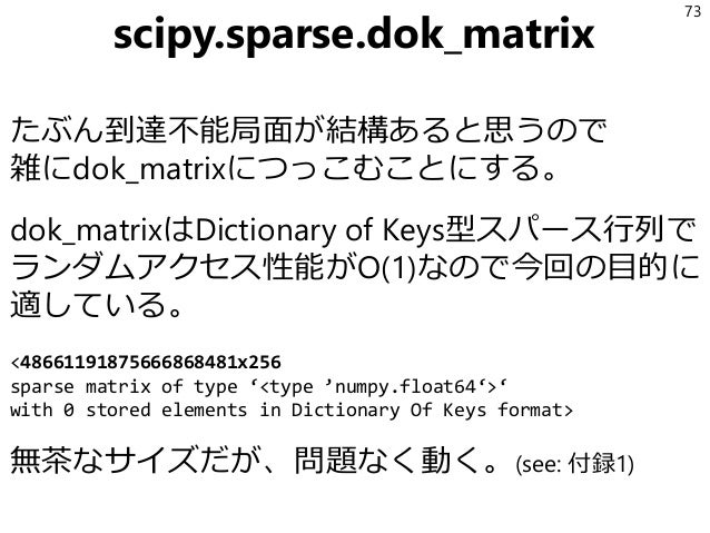 73. 73. scipy.sparse.dok_matrix たぶん到達不能局面が結構あると思うので 雑にdok_matrixにつっこむことにする。 dok_matrixはDictionary of Keys型スパース行列で ランダムアクセス性能がO(1)なので今回の目的に 適している。 <48661191875666868481x256 sparse matrix of type ‘<type ’numpy.float64‘>‘ with 0 stored elements in Dictionary Of Keys format> 無茶なサイズだが、問題なく動く。(see: 付録1) 73
