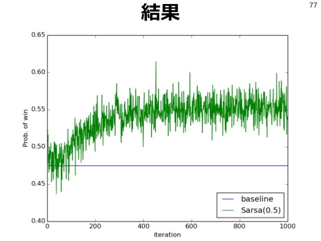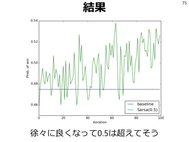 74. 74. 実験条件 Sarsa(後手)とランダムで100,000試合し、 Sarsaの1000試合ごとの勝率をプロットした。 ランダム同士の対戦は1万回中 先手勝ち: 5063, 後手勝ち: 4757, 引き分け: 180 だったので、0.475をベースラインとする。 Sarsaのパラメータ: π=greedy方策, α=0.5, γ=0.9 74