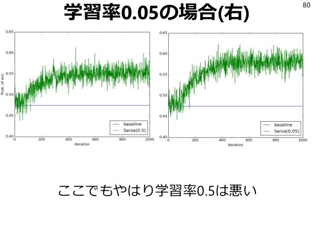 79. 79. 1分あたりの試行数 79 序盤は速度にバラツキがある(最高82804回/分)が最終的に14000回/分に落ち着いた。 これが辞書の設計によるものかSarsaの学習が伸び止まったことによるかは 別途実験しないとわからなさそう。