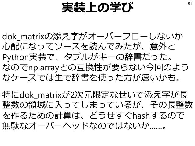 81. 81. 実装上の学び dok_matrixの添え字がオーバーフローしないか 心配になってソースを読んでみたが、意外と Python実装で、タプルがキーの辞書だった。 なのでnp.arrayとの互換性が要らない今回のよう なケースでは生で辞書を使った方が速いかも。 特にdok_matrixが2次元限定なせいで添え字が長 整数の領域に入ってしまっているが、その長整数 を作るための計算は、どうせすぐhashするので 無駄なオーバーヘッドなのではないか……。 81
