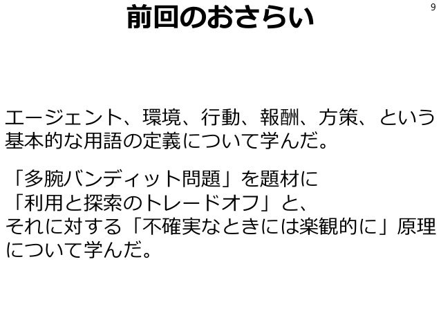 9. 9. 前回のおさらい エージェント、環境、行動、報酬、方策、という 基本的な用語の定義について学んだ。 「多腕バンディット問題」を題材に 「利用と探索のトレードオフ」と、 それに対する「不確実なときには楽観的に」原理 について学んだ。 9
