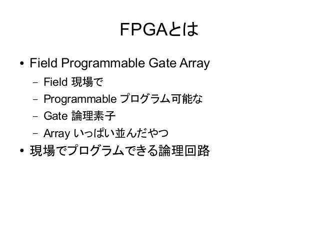2. 2. FPGAとは ● Field Programmable Gate Array – Field 現場で – Programmable プログラム可能な – Gate 論理素子 – Array いっぱい並んだやつ ● 現場でプログラムできる論理回路
