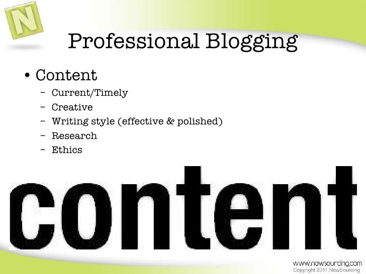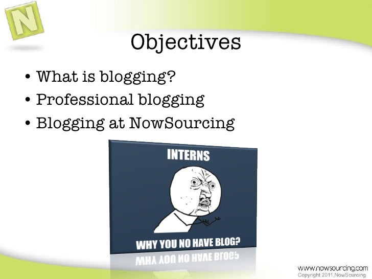 2. 2. Objectives <ul><li>What is blogging? </li></ul><ul><li>Professional blogging </li></ul><ul><li>Blogging at NowSourcing </li></ul>