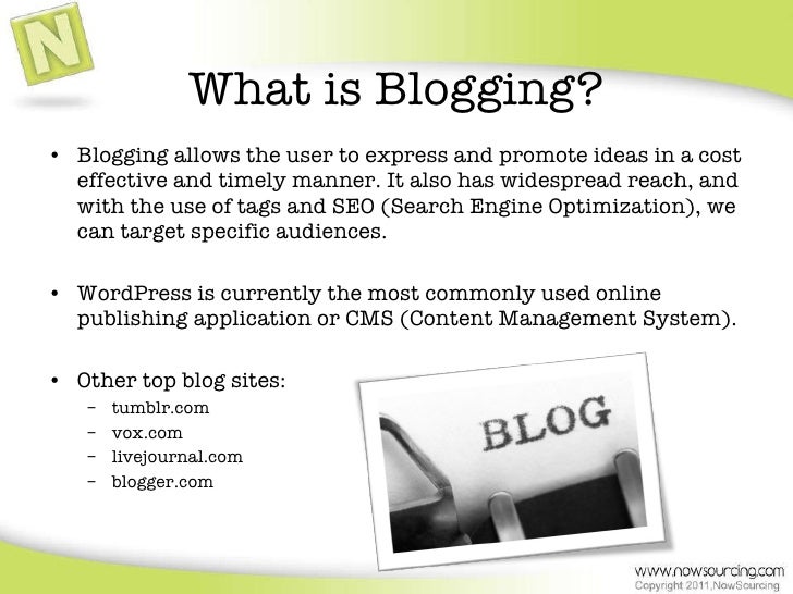 3. 3. What is Blogging? <ul><li>Blogging allows the user to express and promote ideas in a cost effective and timely manner. It also has widespread reach, and with the use of tags and SEO (Search Engine Optimization), we can target specific audiences. </li></ul><ul><li>WordPress is currently the most commonly used online publishing application or CMS (Content Management System). </li></ul><ul><li>Other top blog sites: </li></ul><ul><ul><li>tumblr.com </li></ul></ul><ul><ul><li>vox.com </li></ul></ul><ul><ul><li>livejournal.com </li></ul></ul><ul><ul><li>blogger.com </li></ul></ul>