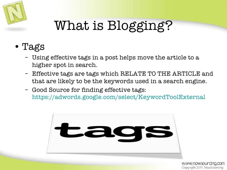 4. 4. What is Blogging? <ul><li>Tags </li></ul><ul><ul><li>Using effective tags in a post helps move the article to a higher spot in search. </li></ul></ul><ul><ul><li>Effective tags are tags which RELATE TO THE ARTICLE and that are likely to be the keywords used in a search engine. </li></ul></ul><ul><ul><li>Good Source for finding effective tags: https://adwords.google.com/select/KeywordToolExternal </li></ul></ul>