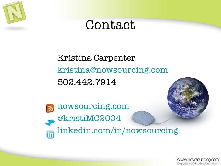 7. 7. Contact <ul><ul><ul><ul><ul><li>Kristina Carpenter </li></ul></ul></ul></ul></ul><ul><ul><ul><ul><ul><li>[email_address] </li></ul></ul></ul></ul></ul><ul><ul><ul><ul><ul><li>502.442.7914 </li></ul></ul></ul></ul></ul><ul><ul><ul><ul><ul><li>nowsourcing.com </li></ul></ul></ul></ul></ul><ul><ul><ul><ul><ul><li>@kristiMC2004 </li></ul></ul></ul></ul></ul><ul><ul><ul><ul><ul><li>linkedin.com/in/nowsourcing </li></ul></ul></ul></ul></ul>