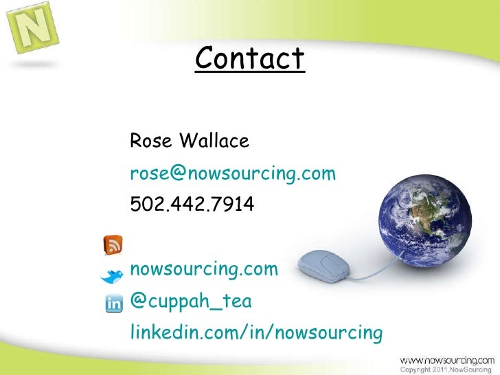 12. 12. Contact <ul><ul><ul><ul><ul><li>Rose Wallace </li></ul></ul></ul></ul></ul><ul><ul><ul><ul><ul><li>[email_address] </li></ul></ul></ul></ul></ul><ul><ul><ul><ul><ul><li>502.442.7914 </li></ul></ul></ul></ul></ul><ul><ul><ul><ul><ul><li>nowsourcing.com </li></ul></ul></ul></ul></ul><ul><ul><ul><ul><ul><li>@ cuppah_tea </li></ul></ul></ul></ul></ul><ul><ul><ul><ul><ul><li>linkedin.com/in/nowsourcing </li></ul></ul></ul></ul></ul>