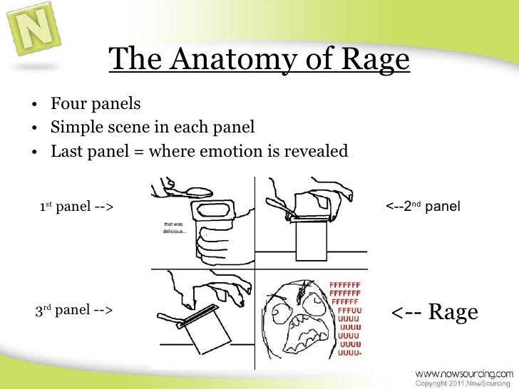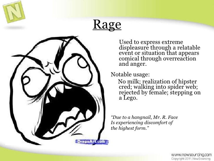 5. 5. Rage <ul><li>Used to express extreme displeasure through a relatable event or situation that appears comical through overreaction and anger. </li></ul><ul><li>Notable usage: </li></ul><ul><li>No milk; realization of hipster cred; walking into spider web; rejected by female; stepping on a Lego. </li></ul><ul><li>“ Due to a hangnail, Mr. R. Face </li></ul><ul><li>Is experiencing discomfort of </li></ul><ul><li>the highest form.” </li></ul>