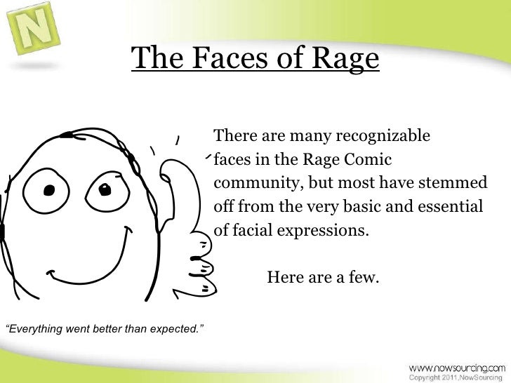 4. 4. The Faces of Rage <ul><li>There are many recognizable </li></ul><ul><li>faces in the Rage Comic </li></ul><ul><li>community, but most have stemmed </li></ul><ul><li>off from the very basic and essential </li></ul><ul><li>of facial expressions. </li></ul><ul><li>Here are a few. </li></ul>“ Everything went better than expected.”